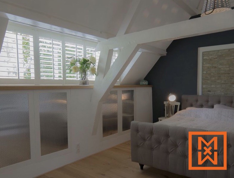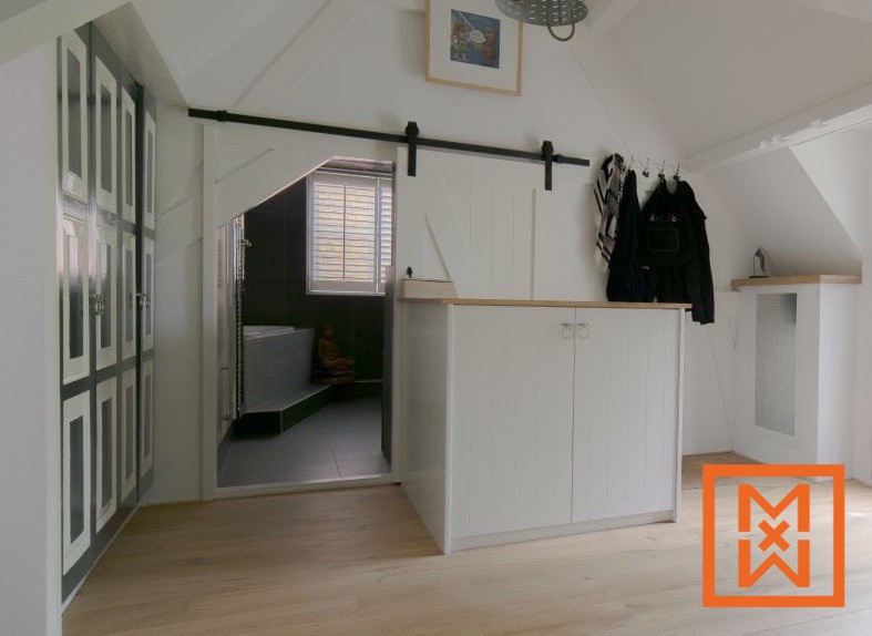 Het resultaat is een moderne badkamer “en suite”, die via een stijlvolle boeren schuifdeur met zwartstalen details direct in verbinding staat met de aangrenzende slaapkamer. De combinatie van landelijke charme en een eigentijdse afwerking zorgt voor een unieke en warme sfeer. De keuze voor een lichte, neutrale tegel op de vloer en wanden benadrukt de ruimtelijkheid en laat de badkamer groter en lichter aanvoelen.