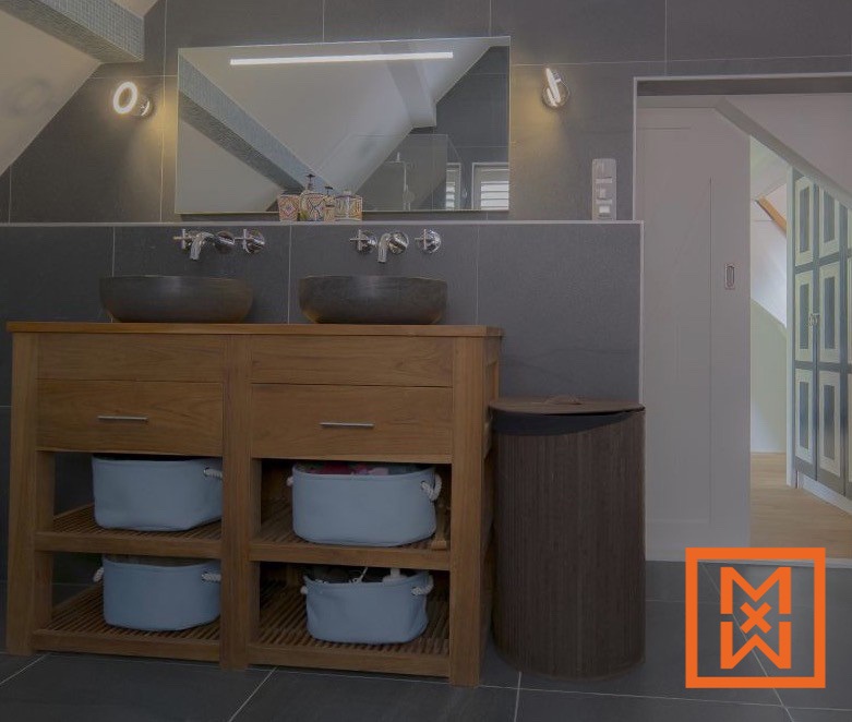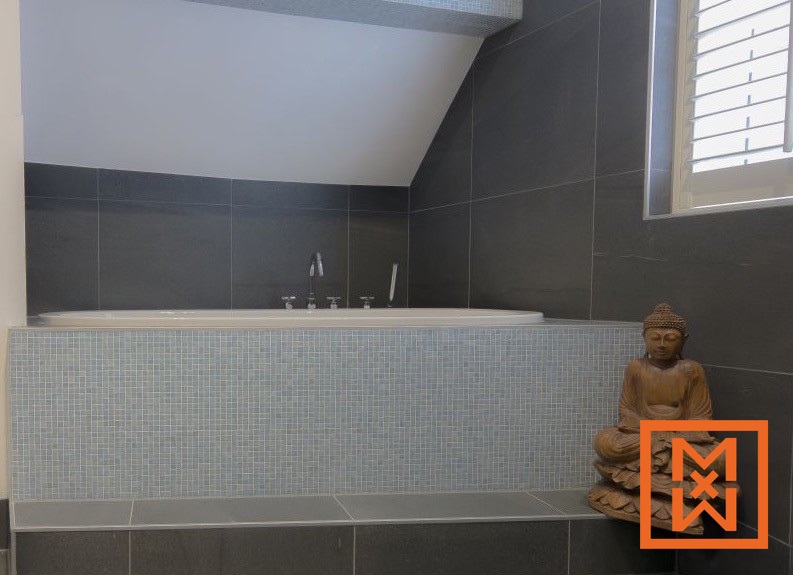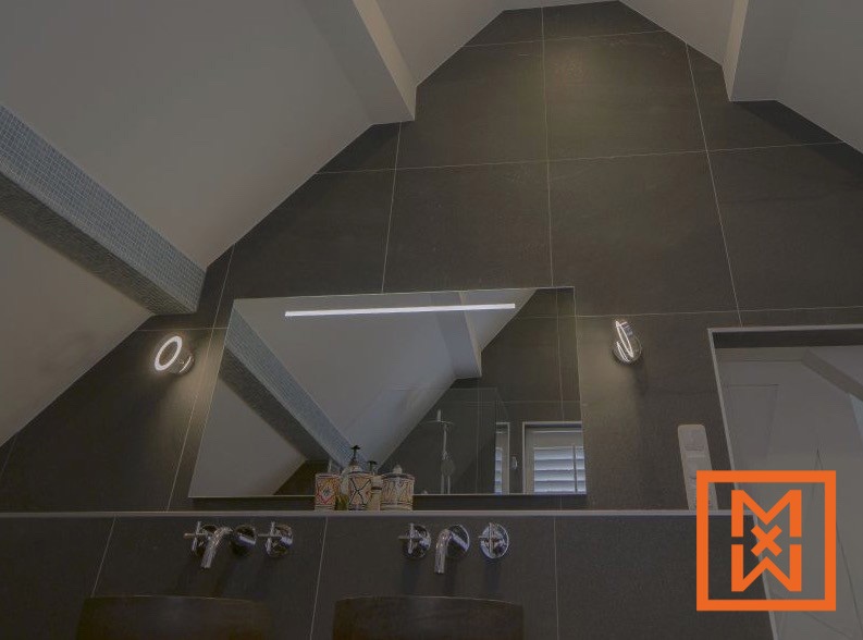 Het ligbad is volledig op maat rondom afgewerkt met multicolor mozaïektegels, die een speels maar chique accent geven aan de ruimte. Het zwevende toilet met softclose-mechanisme creëert een ruimtelijk gevoel en sluit mooi aan bij de strakke lijnen van het ontwerp. De designradiator in matzwart combineert functionaliteit met een krachtig, modern accent. Voor extra gemak zijn er twee wastafels geplaatst op een maatwerkmeubel van eikenhout met een natuurstenen blad, wat warmte en luxe samenbrengt in één ontwerp. Als finishing touch hebben we een volledig op maat gemaakte inbouwkast geplaatst, perfect afgestemd op de rest van het interieur, voor voldoende en discrete opbergruimte.