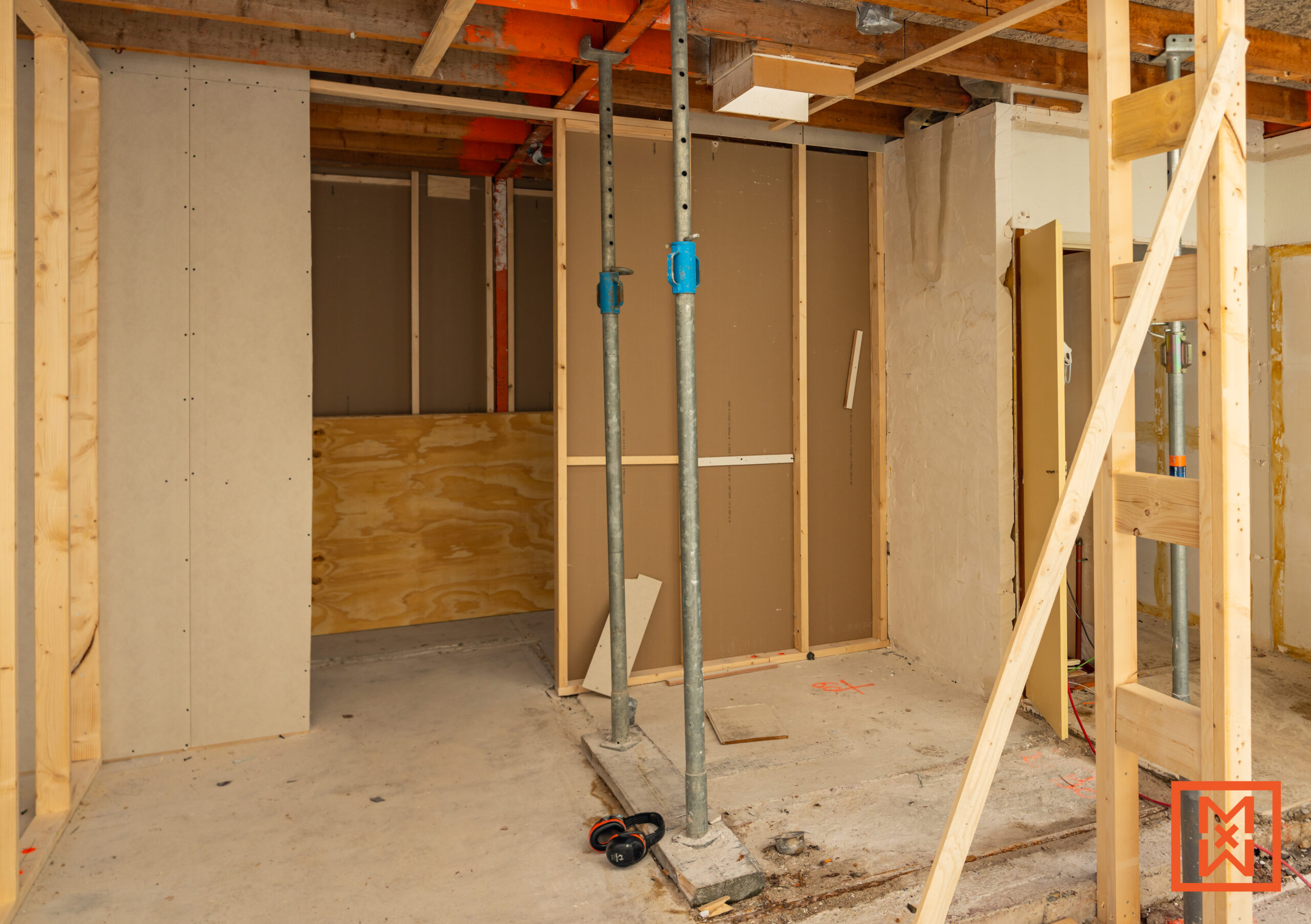 Voorafgaand aan de aanbouw is de bestaande constructie uitgebreid versterkt. Dragende muren zijn aangepast, nieuwe funderingen gestort en houten balklagen vernieuwd om voldoende draagkracht te creëren voor de uitbreiding. Zo vormt de nieuwe aanbouw één geheel met het bestaande gebouw — zowel technisch als esthetisch.